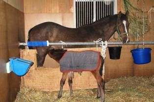 乳母を導入すること自体が、当場では初めての経験となります。乳母として導入する牝馬は、高齢のため落ち着いてはいるものの、少し気性の激しい部分も持ち合わせているために、また子馬が3週齢と導入時期が遅すぎるために、乳母の導入自体が成功するかどうかは非常に不透明であり、さらにホルモン処置によって子馬を発育させるために必要な泌乳量が得られるかどうかという不安も残っていました。 まずは子馬と産みの母馬との離別を行いました。これは予想していたとおり、問題なく終了しました。続いて、乳母と子馬との対面に移りました。乳母を導入する場合に、出産時に産道を胎子が通過するのと類似の刺激を子宮頸管に与えることによって、母性を誘発させられるとの報告に基づき、最初に乳母を枠馬に保定し、用手にて子宮頸管の刺激を実施しました。1度目の刺激時には目の前の子馬を威嚇したり、噛んだりしていましたが、2度目の刺激時には3~4回ではありましたが、子馬の顔を舐める仕草を認めました。しかし、その後も威嚇は続き、子馬が吸乳を試みる際には蹴ろうとするので、後肢を縛り付けることによって、なんとか吸乳が可能となりました。 乳母と子馬の初対面時には、胎子が産道を通過するのと同様の刺激を与えて母性の誘発を試みました。 馬房に収容してからは、子馬の安全確保を最優先として、馬房内に簡易の枠馬を設置し、翌朝まで乳母を収容しました。それでも吸乳時には後肢で蹴ろうとするので、枠馬に畳を吊るし、その一部に小窓を開けて、子馬が安全に吸乳できるようにしました。対面を開始してから5時間が経過した時になってやっとスタッフが乳母の頭絡を持つだけで、抵抗なく吸乳を許すまでになりました。 対面初日は馬房内に設置した簡易枠馬に乳母を収容しました。これにより吸乳時には子馬の安全が確保できました。 翌朝からは、インドアパドックや屋外パドックで2頭一緒に放牧を開始しました。対面開始から5日間は、完全に子馬を受け入れるまでには至らず、機嫌が悪い時には威嚇し、噛み付く素振りを認めることも珍しくはなく、そのために、子馬が避難できるように馬房内に鉄管を渡し、子馬専用のスペースを確保しました。また、子馬への授乳は、スタッフの保定がなければ不可能な状況が続きました。